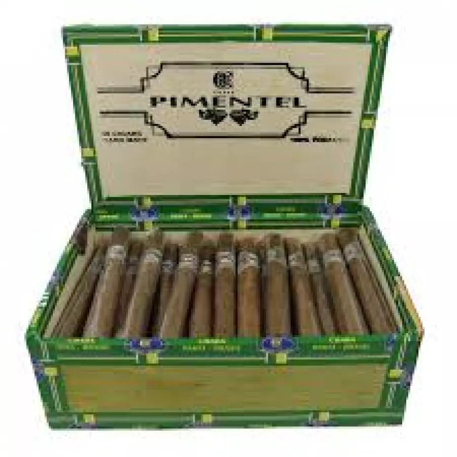 "Charuto - Pimentel - Caixa" representa um produto de tabacaria e, historicamente, está relacionada a uma antiga fábrica de charutos brasileira, especificamente a Pimentel Indústria de Charutos Ltda.
