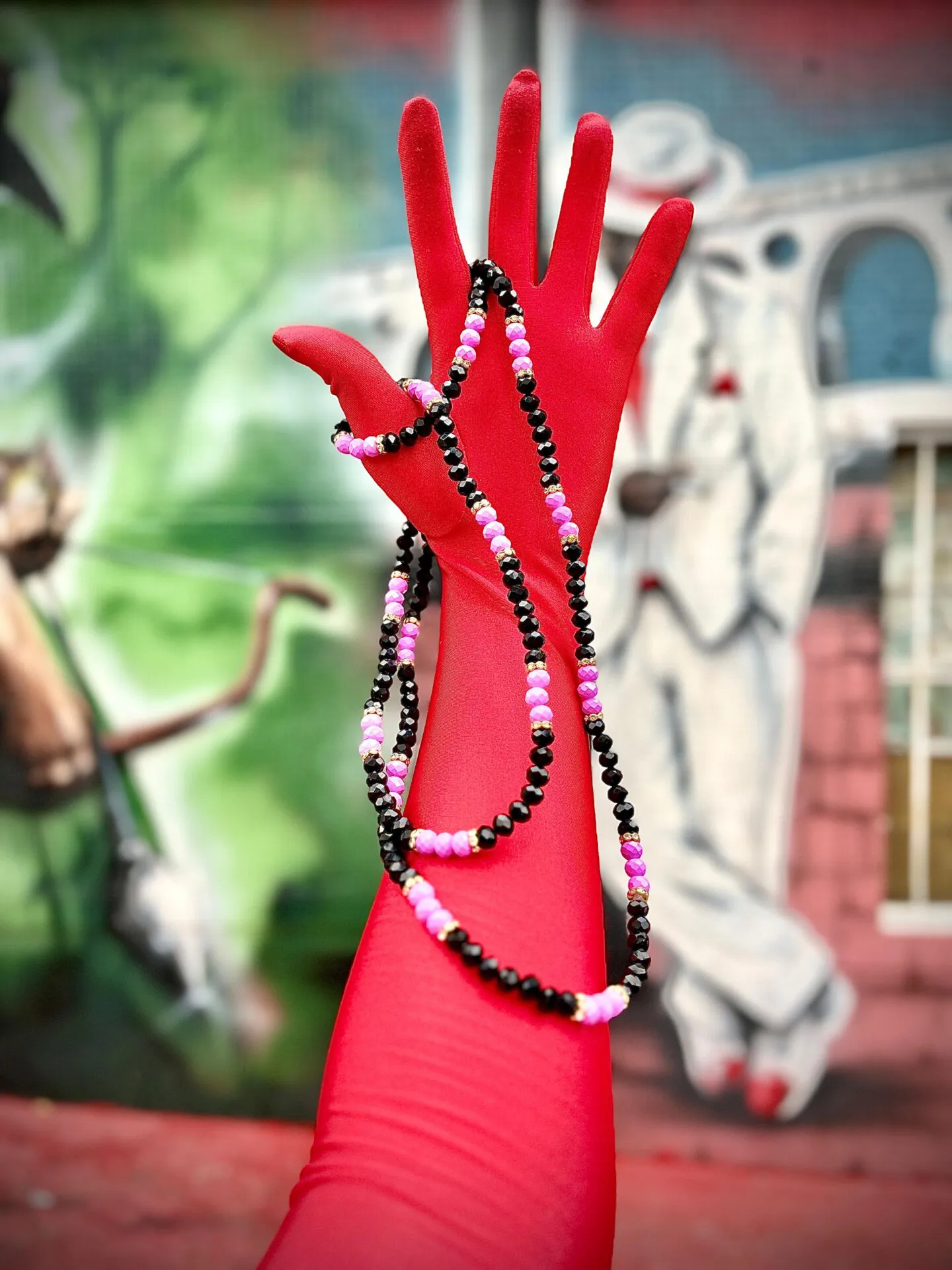 Na Umbanda, uma guia de cristal roxo e preto para a Pomba Gira Maria Mulambo representa a conexão com a energia da entidade, utilizando as cores para simbolizar aspectos de sua atuação.