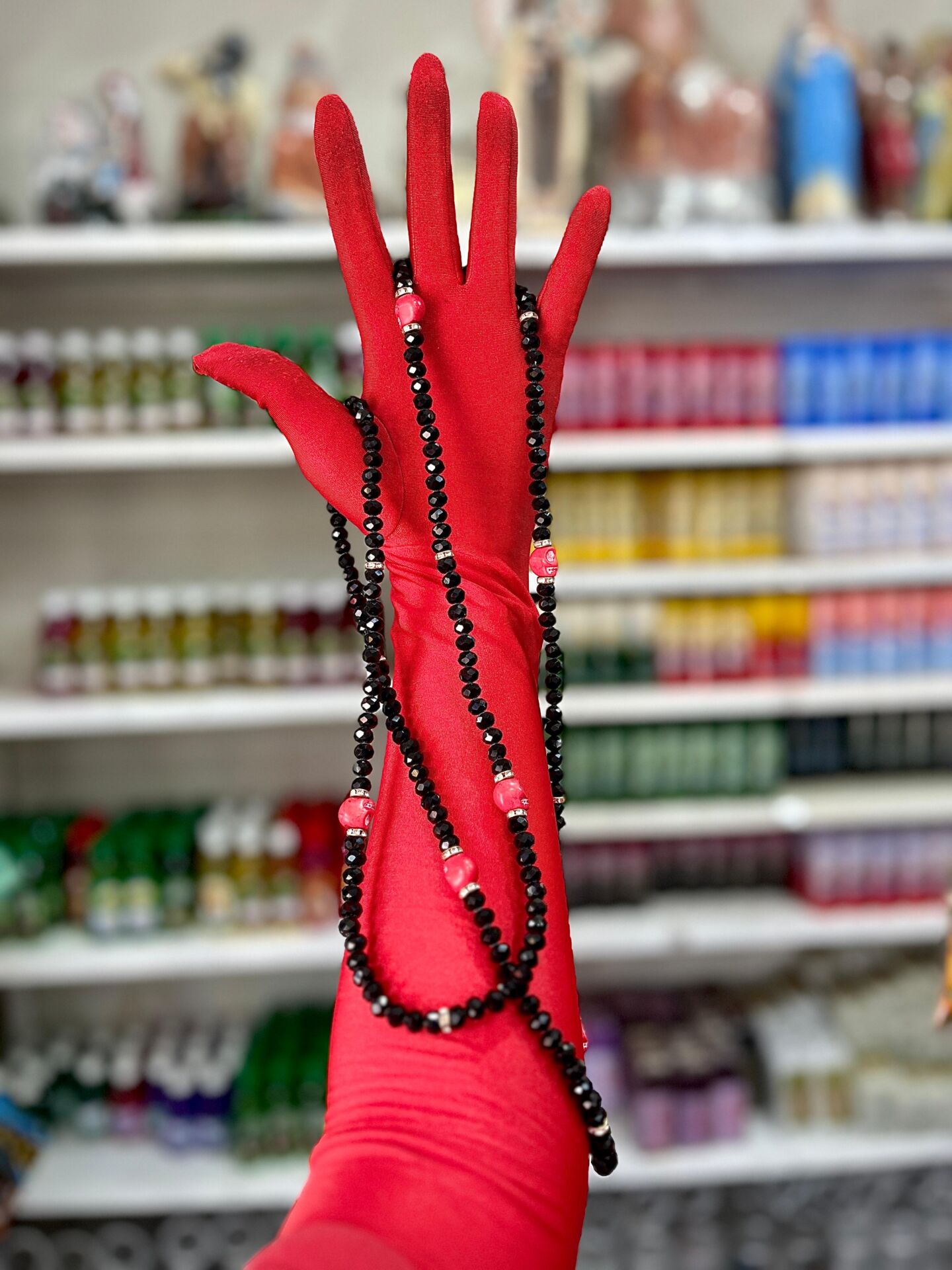 - Material: Confeccionada com cristais pretos e vermelhos de 8mm ou 10mm, a guia pode incluir caveiras de howlita ou outros materiais, entremeios e firmas de murano.