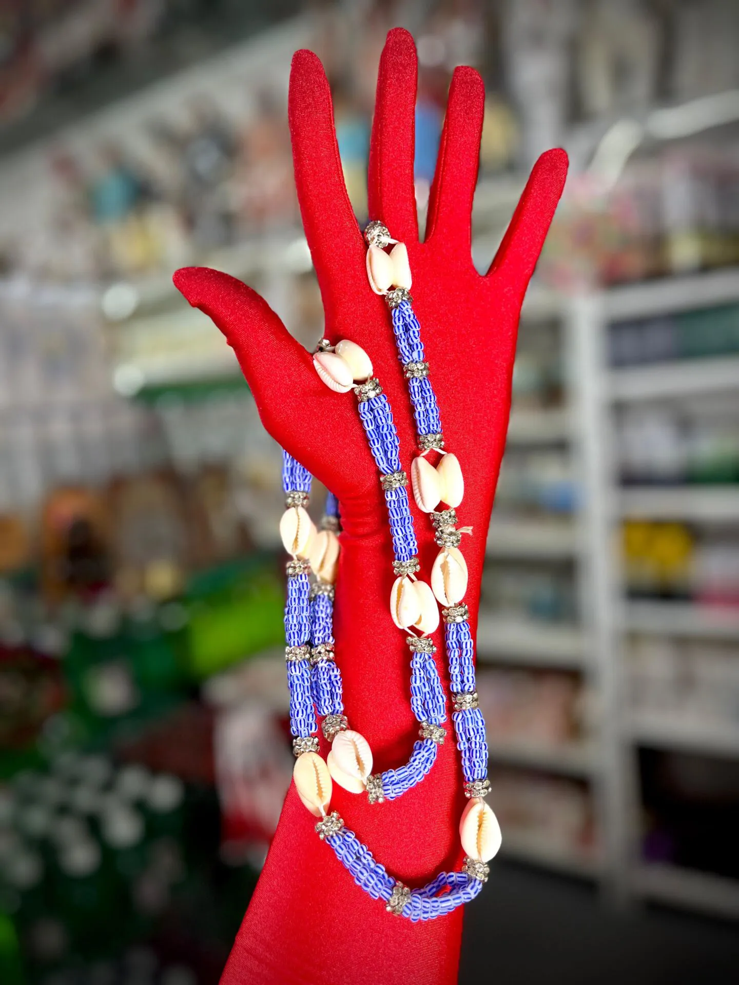 - Linha do Mar: É possível que a guia esteja ligada a entidades da Linha do Mar, como as Sereias, Caboclos-do-Mar e Marinheiros. As cores e os búzios reforçam a conexão com o universo marítimo.