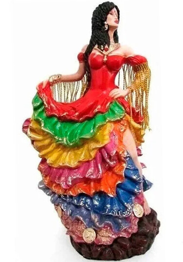 A imagem da Cigana Sete Saias Colorida, produzida por Camasi, representa uma entidade mística e poderosa das religiões afro-brasileiras, como a Umbanda.