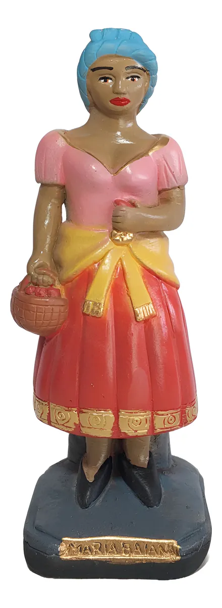 Força feminina: Frequentemente retratada com vestes coloridas típicas da Bahia, turbante e adornos, Maria Baiana simboliza a força e a espiritualidade da mulher baiana.